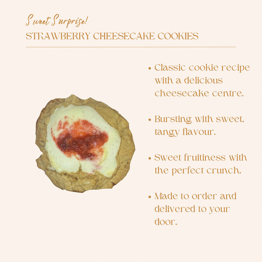 Our Strawberry Cheesecake Cookies are where classic cookie comfort meets creamy cheesecake indulgence. A buttery base filled with smooth cheesecake and sweet strawberry topping ā the perfect balance of tangy and sweet in every bite. āØ
